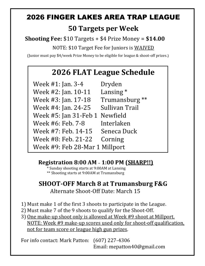 Here’s the schedule for the upcoming Finger Lakes Area Trap League. If you are interested in shooting on behalf of the Club, please join in.